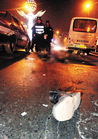 昨天18时,哈尔滨市道里区经纬街与地段街交口处,一辆出租车与一辆自行车相刮,骑车男子倒地后被一辆16路公交车碾压,当场身亡。