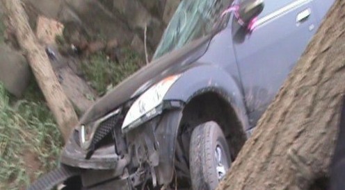 记者注意到,越野车反光镜处还系着婚礼车队所用的拉花,越野车是参与迎亲的车辆。据现场一市民介绍,事故发生在早上8时许,当时越野车是跟着婚礼车队一路的,没想到与迎面驶来的摩托车突然发生相撞。越野车躲避不及,在撞倒摩托车后又撞上公路右边的一处院坝围墙,最后栽下了路坎。