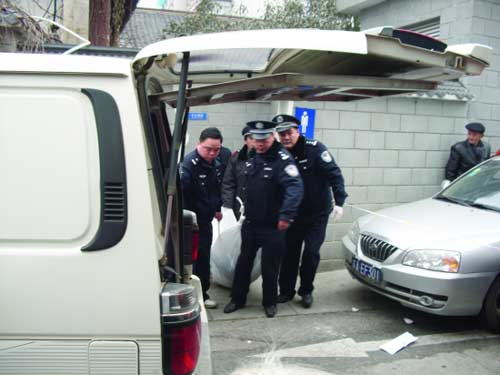 厕所中死亡男子被抬上车。