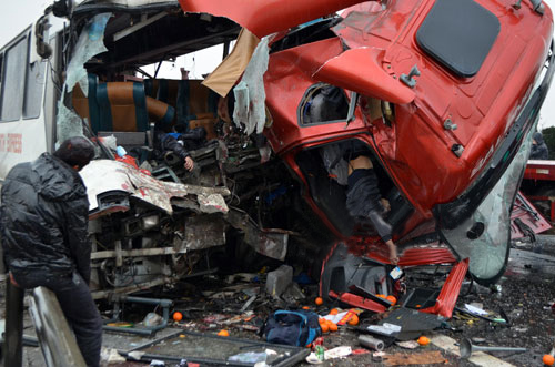 大客车受损严重,现场死亡3人。