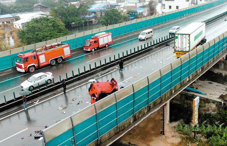 “我现在在礼乐礼义二路,从上面的高速公路桥上掉了好多货柜车零部件下来,应该是发生车祸了,你们能来了解一下吗?”昨日下午3点,记者接到市民报料,怀疑在中江高速礼乐段发生一起严重交通事故。记者接报后迅速赶往现场。