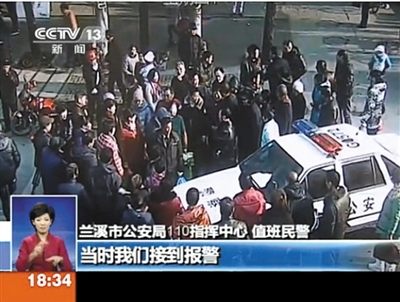 浙江兰溪,警车遭到“全能神”教徒围堵。央视视频截图