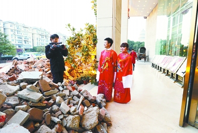 建筑垃圾堵了酒店大门,也影响了新人办婚礼。记者杨涛摄