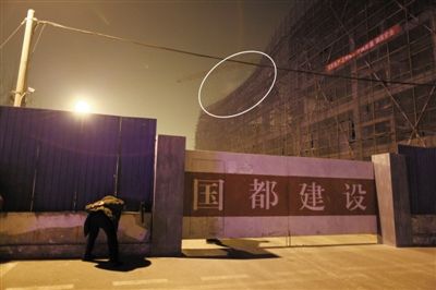 昨晚,市民从缝隙中看坍塌现场。当日,丰台区靛厂路北侧,一幢在建五层楼顶层坍塌,图中白圈内为坍塌位置。
