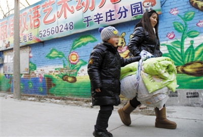 昨日,沙河镇于辛庄村雨佳双语艺术幼儿园门口,王女士带着儿子童童(化名)离开这所幼儿园。实习生 徐洋 摄