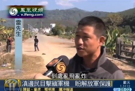 据凤凰卫视报道,云南省西南部盈江县的那邦镇,和目前克钦独立军总部所在地拉咱只隔着一条河。这里的居民说,3号下午还看到飞机在拉咱山区的上空轰炸。有民众看到在离村子约20公里的中缅6号界桩附近上空,有缅甸政府军的飞机盘旋。而他们最近一次听到对面的炮火声,是在4号下午。