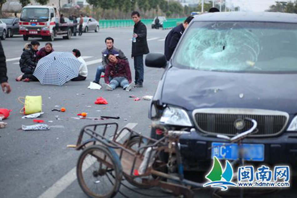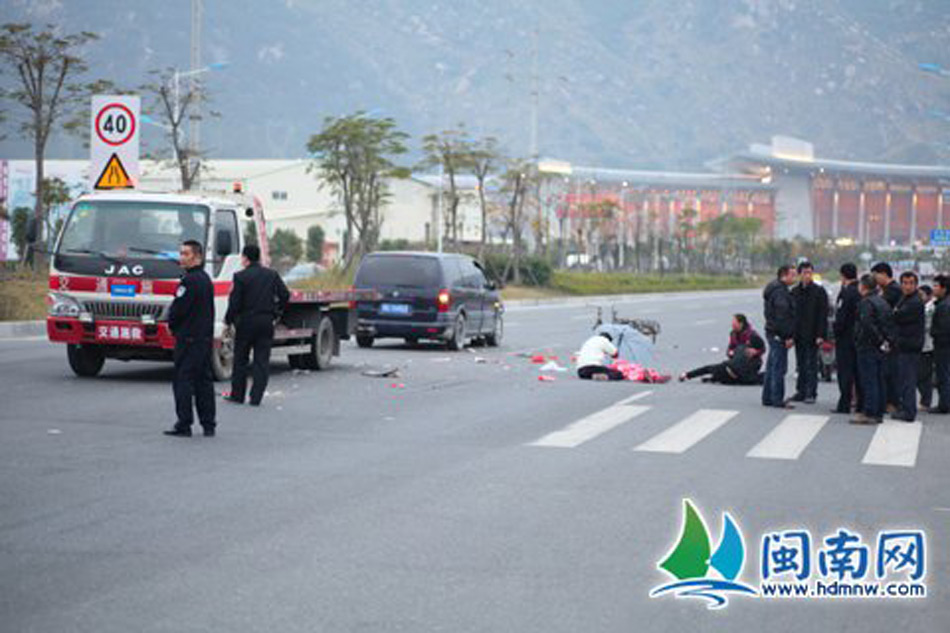 闽南网1月13日讯昨日下午4时许,泉州动车站南北大道上,陈阿伯和陈阿婆夫妻俩踩三轮车过斑马线时,被一辆别克商务车撞倒,陈阿婆当场身亡,陈阿伯送医抢救无效死亡。肇事司机曾某目前已被警方控制,事故原因还在进一步调查中。