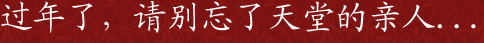 春节,象征着辞旧迎新,吉庆欢乐,是中华民族最隆重的传统佳节。春节也是祭祖祈年的日子,我们欢喜一堂,辞旧岁、迎新年的同时不能忘记天堂的故人,问候、祝福、年货,一样也不能少,各位会员们,也赶快给天堂的故人置办年货吧,让他们过一个喜庆的新年!